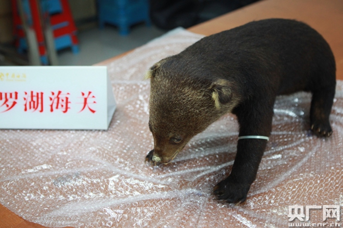 羅湖海關(guān)關(guān)員介紹到:“這只小熊看起來憨態(tài)可掬,相當(dāng)可愛?涩F(xiàn)在被殘忍殺害,只剩軀殼制成標(biāo)本,真是令人感到痛惜!”