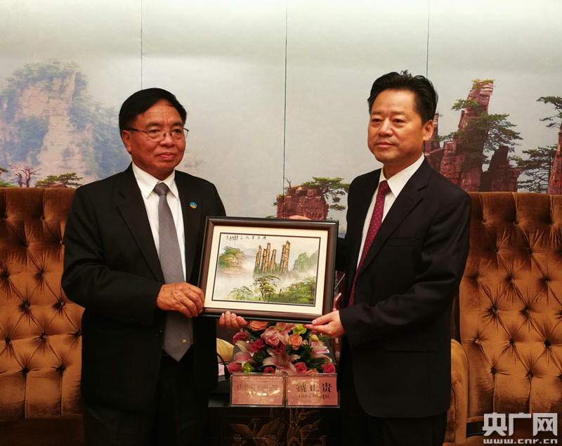 張家界市委書記虢正貴(右)與老撾省委書記訪問團(tuán)團(tuán)長坎堅(jiān)·馮珀西友好交流