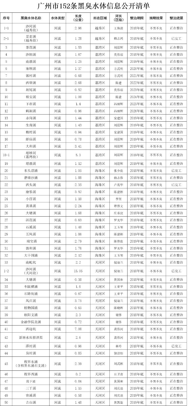根據(jù)《廣州市黑臭水體整治工作意見》和《廣州市治水三年行動計劃(2017-2019年)》,共有187條黑臭河涌被納入整治計劃。其中,列入國家環(huán)保部和住建部監(jiān)管平臺的35條黑臭河涌已于2017年底前完成整治任務(wù),經(jīng)第三方評估已達到“初見成效”目標。