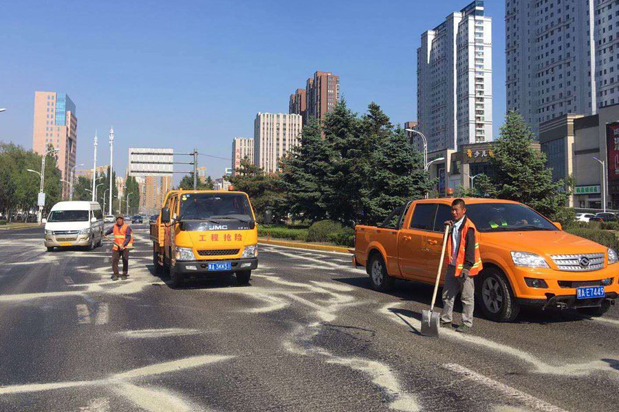 5月29日下午,董玄理曾告訴記者,世茂大道是松北區(qū)的一條老街,因東北冬天寒冷,路面多處發(fā)生凍脹收縮開裂現(xiàn)象。由于資金不足,無法重鋪路面徹底解決問題,所以每年只能在5月初對路面裂縫進行瀝青灌注。往年從未發(fā)生過類似大面積曬化情況,經(jīng)檢測,今年5月9日和19日的兩次,是施工單位使用的瀝青延度不足,導(dǎo)致熔點過低進而被曬化污損路面。