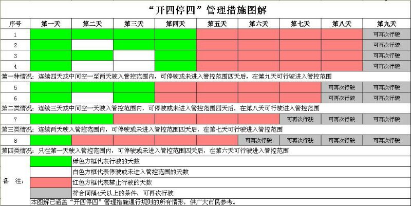 通告主要內(nèi)容為:非廣州市籍中小客車(含臨時號牌車輛)駛?cè)牍芸貐^(qū)域連續(xù)行駛時間最長不得超過4天(自然日,下同),再次駛?cè)腠氶g隔4天以上,簡稱“開四停四”管理措施。