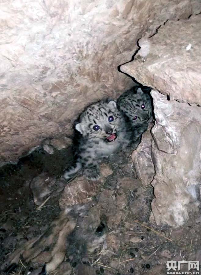 曲麻萊管理處資源環(huán)境執(zhí)法局森林公安局提供的照片場(chǎng)景,是兩年前在曲麻萊縣挖完蟲草回家的牧民拍攝的,照片中三只還在哺乳期的乳雪豹睜著明亮的大眼睛在巢穴里等待母親,雪豹母親則在附近的一塊空地閑逛。