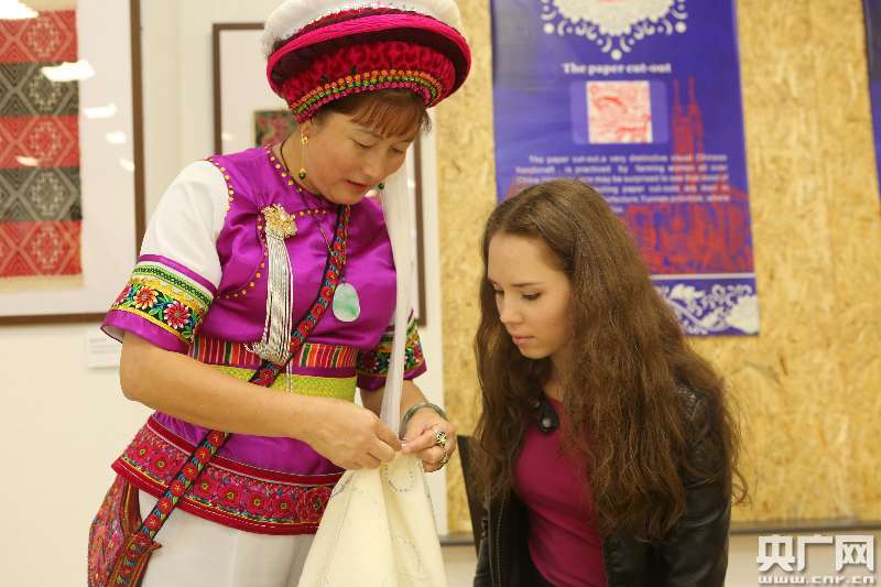 深圳市文體旅游局?jǐn)y深圳天下國(guó)際文化產(chǎn)業(yè)有限公司帶來(lái)的扎染、琺瑯銀器、民族刺繡、儺面畫(huà)、漢畫(huà)拓片等20余種具有時(shí)代特色的中國(guó)非物質(zhì)文化遺產(chǎn)文化創(chuàng)意產(chǎn)品參加展覽,受到當(dāng)?shù)厥忻竦臒崃覛g迎。