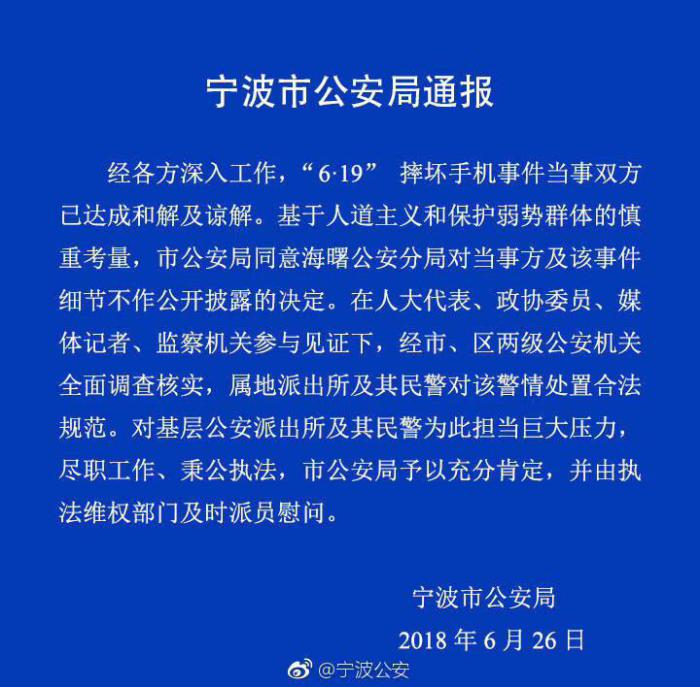 今天,寧波市公安局通過新浪官方微博回應(yīng)網(wǎng)友關(guān)注。警方稱:“6·19”摔壞手機(jī)事件當(dāng)事雙方已達(dá)成和解及諒解,出于人道主義,警方對(duì)當(dāng)事方及該事件細(xì)節(jié)不做公開披露。