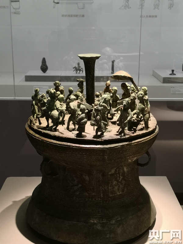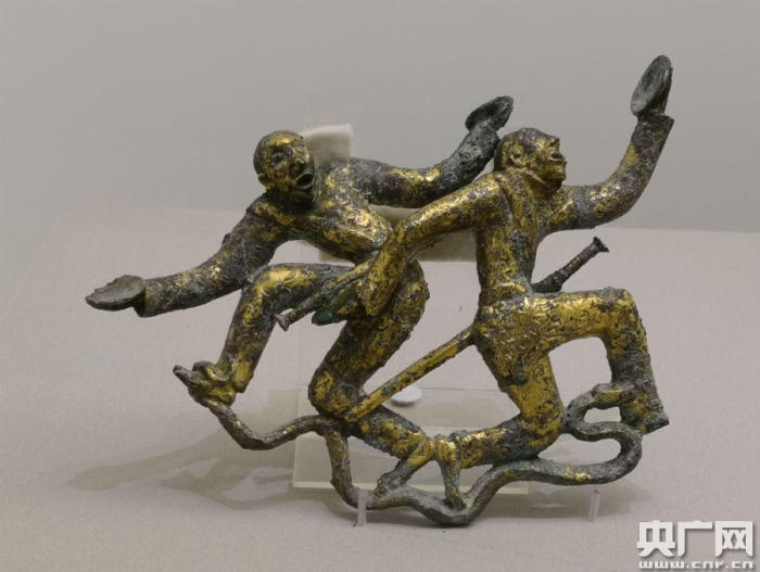 在展覽現場,記者看到籍田祭祀場面銅貯貝器、疊鼓形狩獵場面銅貯貝器、四牛鎏金騎士貯貝器、鎏金雙人盤舞銅扣飾等多件精美青銅器。其中,貯貝器是用來貯藏海貝的青銅容器,是滇青銅文化的獨特產物,是滇國王侯貴族身份與地位的象征。籍田祭祀場面銅貯貝器器身為銅鼓形,頂部圓片狀蓋子上圖像表現的是在貴婦人主持下即將舉行一次與農業(yè)有關的祭祀和利用祭祀進行趕集貿易活動的場面,布局疏密有致,人物形態(tài)生動逼真。疊鼓形狩獵場面銅貯貝器是由兩鼓上下重疊焊鑄而成,器蓋上鑄有立體狩獵場面,是現今出土的滇國文物中唯一一件表現狩獵場面的疊鼓形貯貝器,在器物線刻紋飾中出現了人物裝扮的類似獅子的形象和長象牙的動物、牦牛等,為滇國的對外文化交流提供了新的證據。四牛鎏金騎士貯貝器束腰圓筒形,器蓋正中鑄有1個鎏金騎士,頭梳椎髻,腰佩長劍,穿緊身衣褲,坐騎之馬昂首挺身,張口、翹尾,顯得十分威武,蓋周立雕4牛,腰肥體壯,抬頭垂尾作行走狀。鎏金雙人盤舞銅扣飾上兩名服飾相同的舞者,頭后梳條形小髻,高鼻、深目,著緊身褲,腰部束帶,身側佩劍,雙手執(zhí)圓盤,作邊歌邊舞狀,其下有1條蛇,口咬前人之右足,尾繞后人之左足。從兩名舞者的形象特征與裝束看,應是異域來客,有學者認為他們是北方草原游牧民族“塞人”。