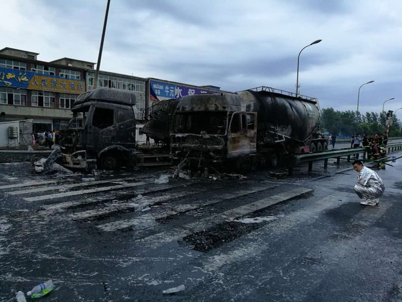 據(jù)了解,油罐車在起火前裝有汽油,兩車追尾后便起火,司機已經(jīng)無法控制,立即下車撥打了報警電話,由于火勢蔓延較快引發(fā)大火,經(jīng)過消防隊員近130分鐘的緊張撲救,大火才被完全撲滅。