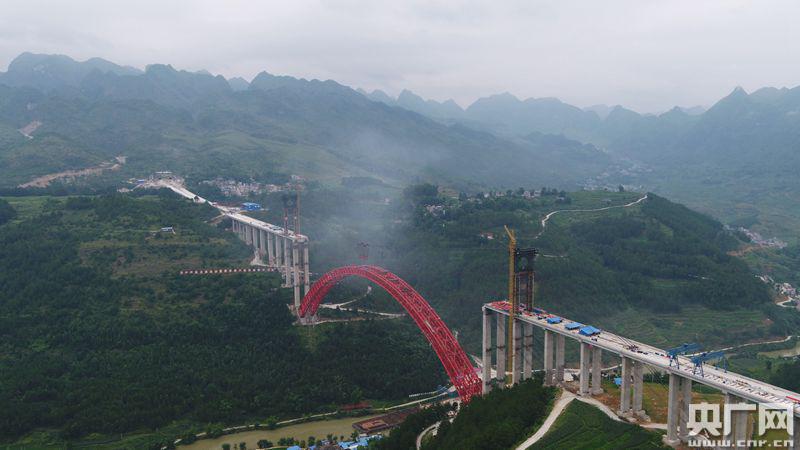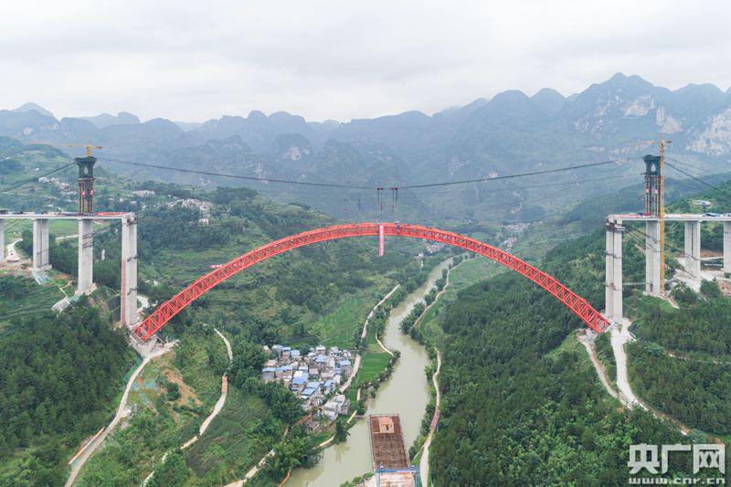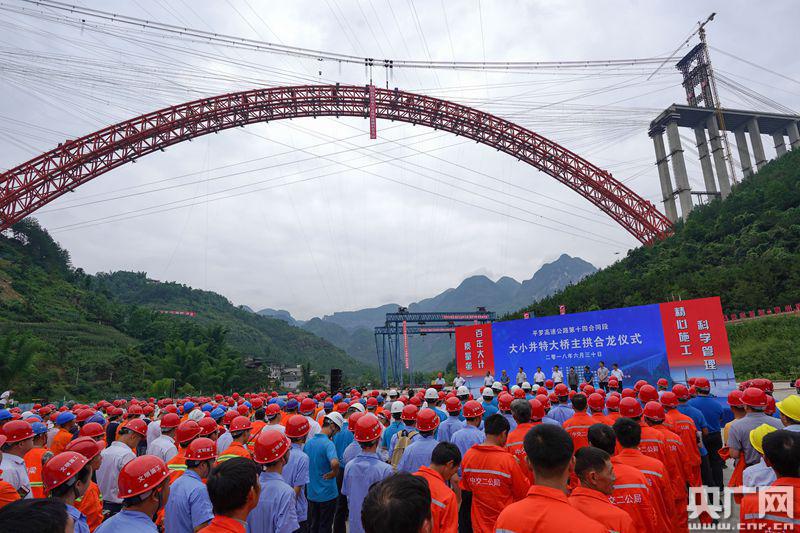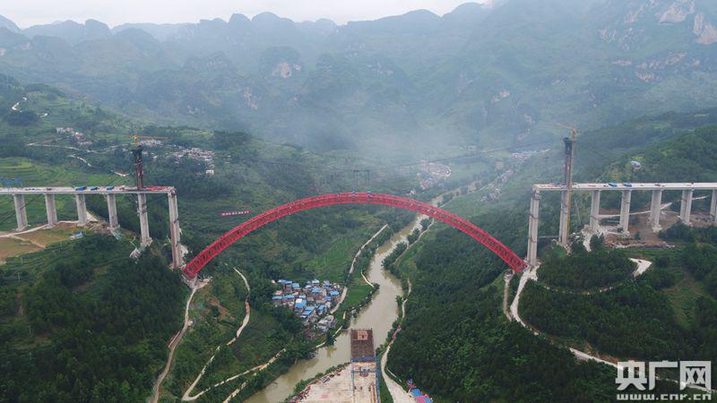 央廣網(wǎng)貴陽7月1日消息(記者張兆福)昨天上午,貴州黔南州平塘到羅甸高速公路大小井特大橋傳來捷報(bào),隨著最后一節(jié)鋼管吊裝安裝就位,世界最大跨徑上承式鋼管混凝土拱橋主拱圈順利合龍。這標(biāo)志著“世界橋梁博物館”的貴州再次刷新世界記錄,又添一座世界級(jí)橋梁。大小井特大橋?qū)Φ、桂、黔石漠化集中連片特困地區(qū)的脫貧攻堅(jiān)有重要推動(dòng)意義。