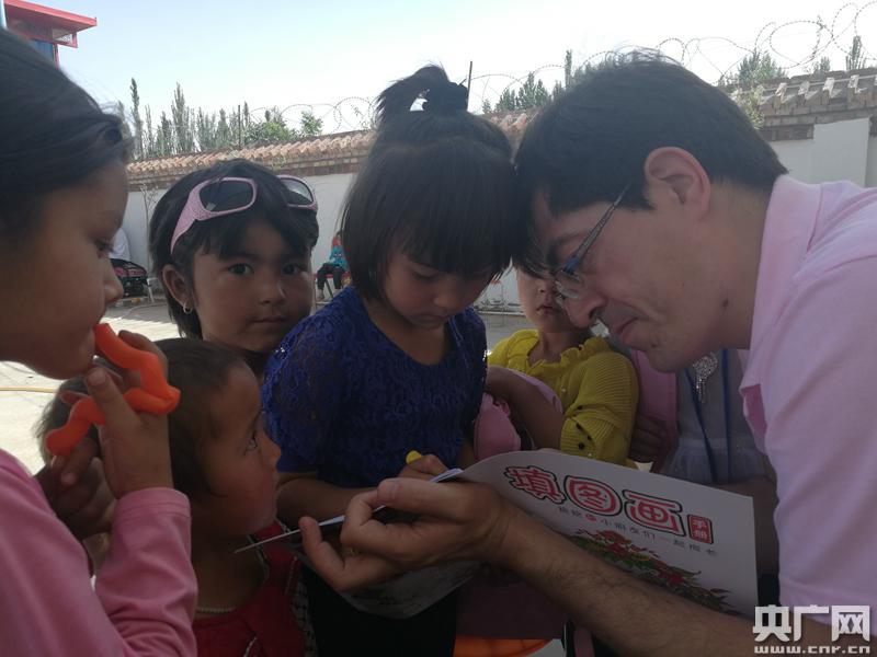 駐村干部吐爾孫·艾拜與和田塔瓦庫勒鄉(xiāng)巴克墩村小朋友在一起
