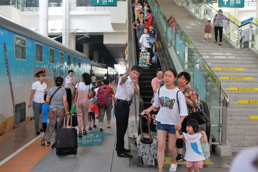 工作人員引導游客進站乘車 張永恒攝