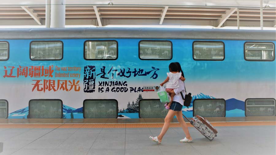 央廣網(wǎng)烏魯木齊7月13日消息(記者吳卓勝 通訊員吳奇)“人群中一眼就能看到你——駝鈴悠悠、雪峰巍巍!12日11時20分,當重裝上陣的“暢覽南疆”旅游列車?吭跒豸斈君R站時,雙層車廂外部的搶眼的巨幅畫卷頃刻間就能讓游客感受到:遼闊疆域、無限風光,新疆是個好地方。