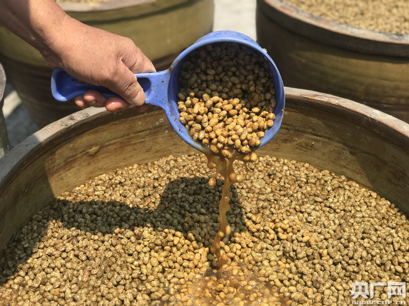 7月24日,董希良在展示生態(tài)醬油豆料。陳屹 攝