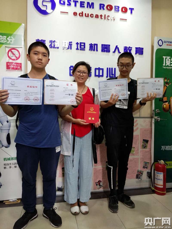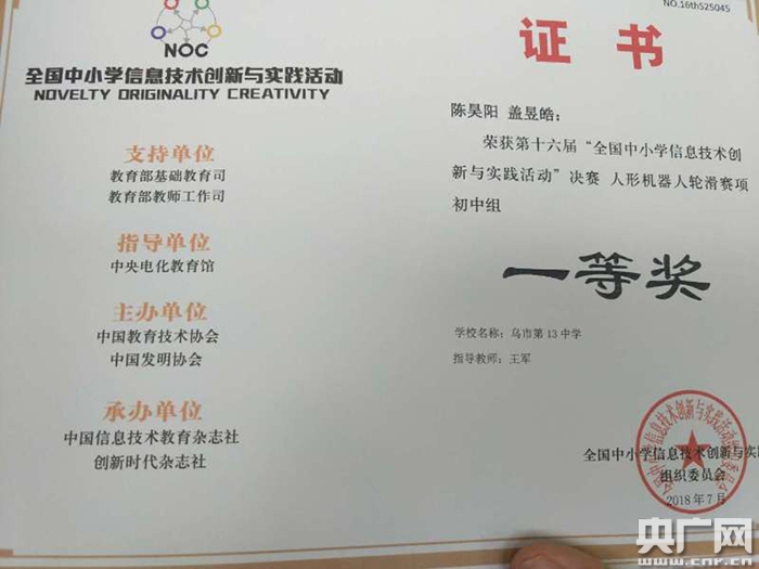 新疆學(xué)生獲得全國“人型機(jī)器人輪滑賽”初中組一等獎證書(央廣網(wǎng)發(fā) 李光明 攝)