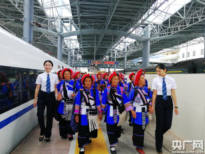 彝族群眾在大理站幸福體驗昆楚大鐵路動車出行(央廣網發(fā) 李喜喜 攝)