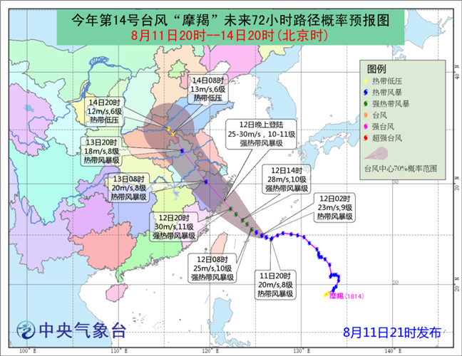 今年第14號(hào)臺(tái)風(fēng)“摩羯”未來(lái)72小時(shí)路徑概率預(yù)報(bào)圖。(資料圖:來(lái)源中央氣象臺(tái)官網(wǎng))