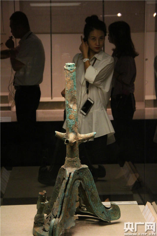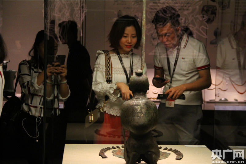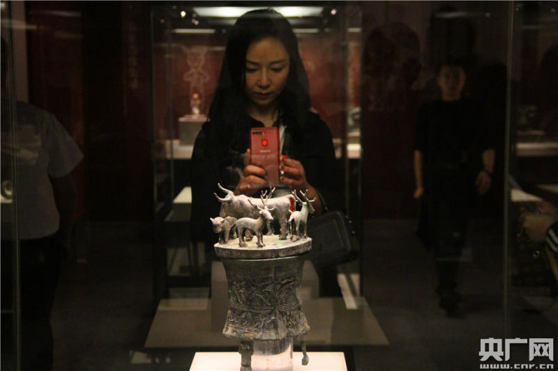 一名觀眾在欣賞“戰(zhàn)國時期的虎鹿牛銅貯貝器”(央廣網(wǎng)發(fā) 記者賈宜超攝)