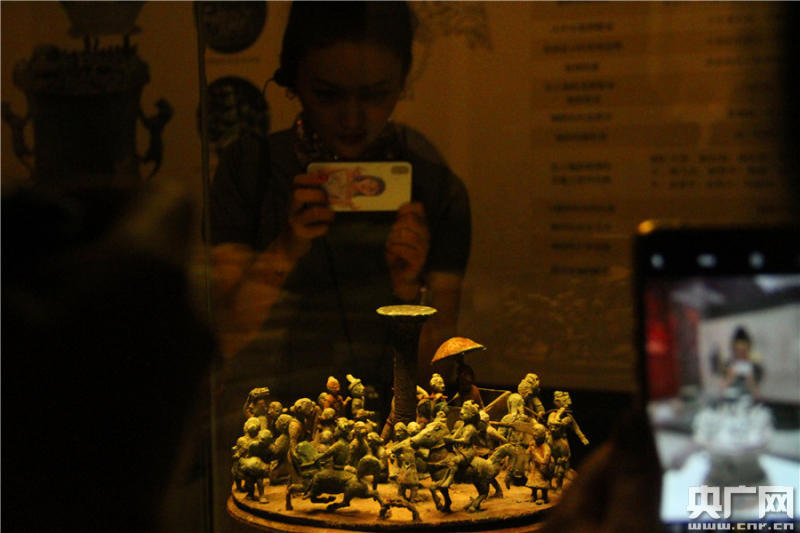 觀眾在欣賞“西漢時期的執(zhí)傘跪坐俑”(央廣網(wǎng)發(fā) 記者賈宜超攝)