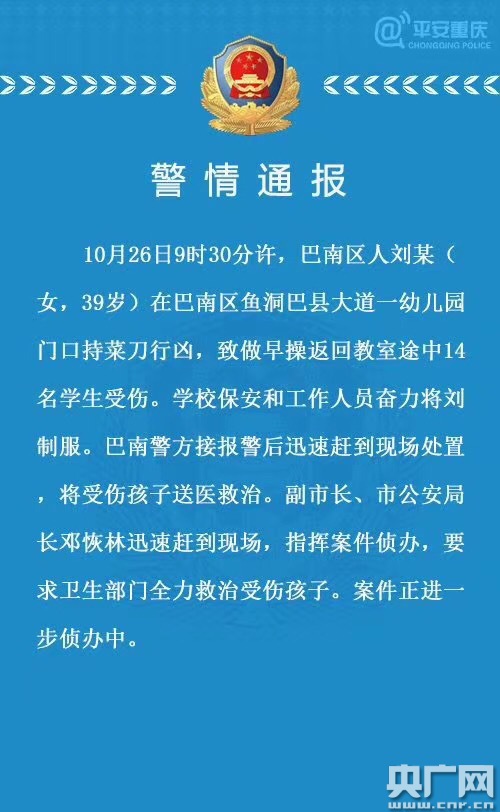 根據(jù)重慶市公安局官方發(fā)布的“警情通報(bào)”,犯罪嫌疑人劉某,女,39歲,在巴南區(qū)魚洞巴縣大道一幼兒園門口持菜刀行兇,致做早操返回教室途中14名學(xué)生受傷。學(xué)校保安和工作人員奮力將劉某制服。巴南警方接報(bào)警后迅速趕到現(xiàn)場(chǎng)處置,將受傷孩子送醫(yī)救治。副市長、市公安局長鄧恢林迅速趕到現(xiàn)場(chǎng),指揮案件偵辦,要求衛(wèi)生部門全力救治受傷孩子。案件正在進(jìn)一步偵辦中。