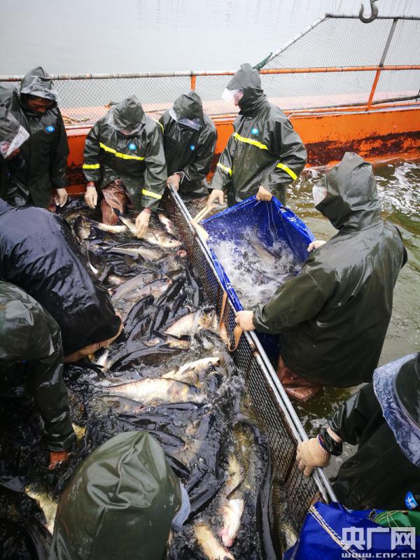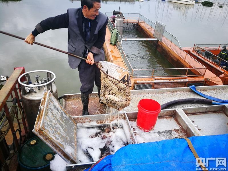 他說:“這個是白鰱,是吃浮游植物的,這個黑一點的是吃浮游動物的。這邊有個閘門,可以直接放水,直接用湖里面的水就可以直接把魚運出來,利用了潛水艇的原理,靠的是浮力,底下全部布滿了氧氣管!