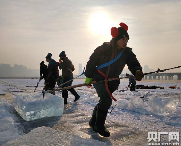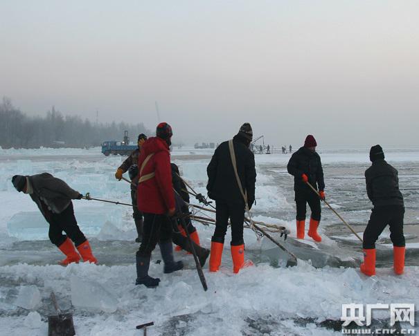 取冰人正在將冰塊從江面拖拽出來(lái),這樣一份工作一天的工資有300塊錢,冰雪旅游讓以前“貓冬”的東北人也忙了起來(lái)。央廣網(wǎng)記者 遲嵩攝
