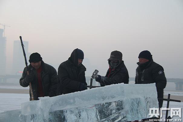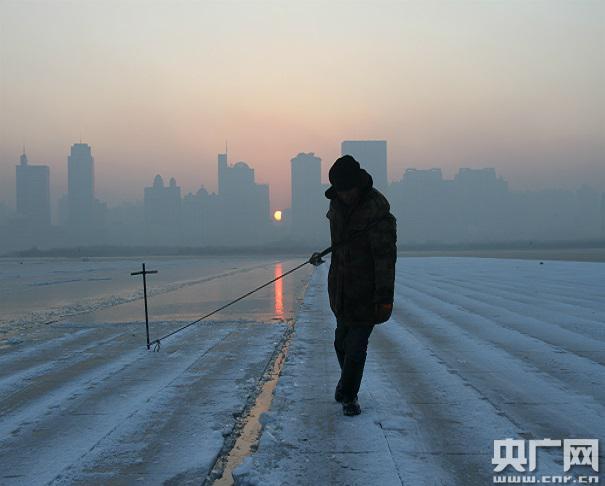 早晨6點(diǎn)37分,天剛蒙蒙亮,取冰人已經(jīng)在零下21度的江面上開(kāi)始一天的工作。央廣網(wǎng)見(jiàn)習(xí)記者 唐國(guó)榮攝