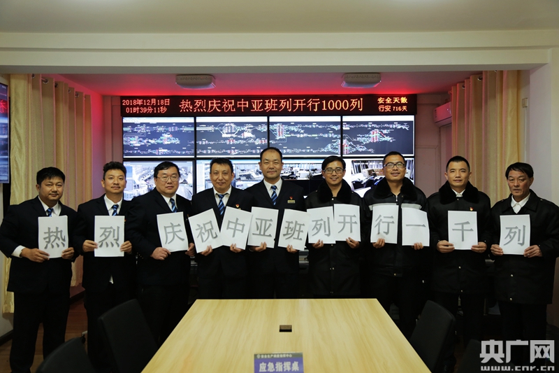 中國(guó)鐵路昆明局集團(tuán)開(kāi)遠(yuǎn)車務(wù)段當(dāng)班職工慶祝中亞班列開(kāi)行周年突破1000列。央廣網(wǎng)發(fā) 劉昊亮攝