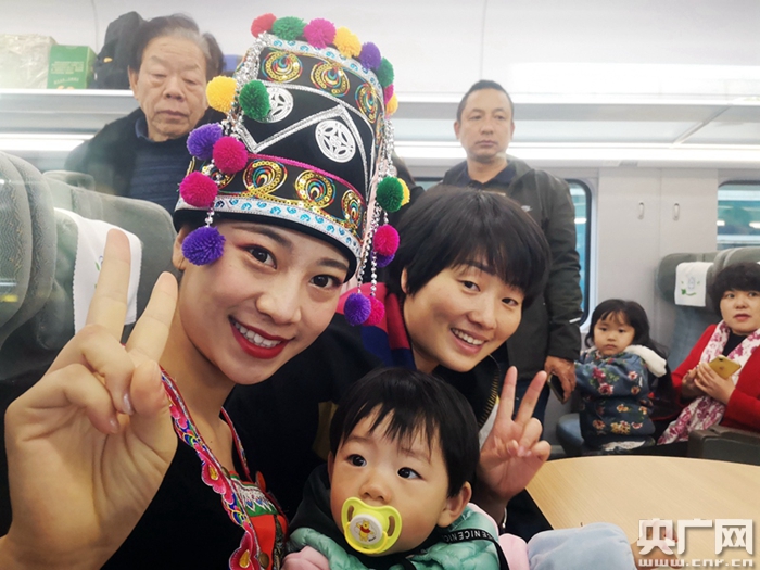 旅客在昆明至蒙自首次開(kāi)行的時(shí)速160公里的CR200J型復(fù)興號(hào)動(dòng)車(chē)上歡呼(央廣網(wǎng)發(fā) 圖片由中國(guó)鐵路昆明局集團(tuán)公司提供)