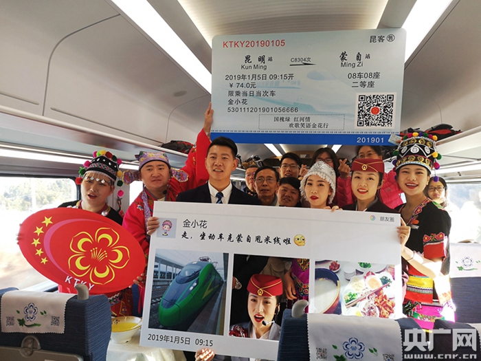 當(dāng)天,云南昆明、建水、蒙自等車(chē)站熱鬧非凡,當(dāng)?shù)厝罕娸d歌載舞,喜迎復(fù)興號(hào)的開(kāi)行。
