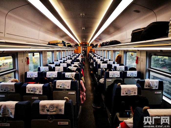 旅客乘坐在復(fù)興號(hào)動(dòng)車(chē)寬敞明亮的車(chē)廂里(央廣網(wǎng)發(fā) 圖片由中國(guó)鐵路昆明局集團(tuán)公司提供)