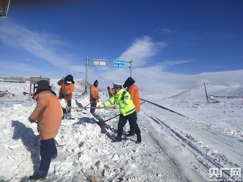 交警和道路養(yǎng)護部門聯(lián)合清理路面積雪 央廣網(wǎng)發(fā) 瑪多交警供圖