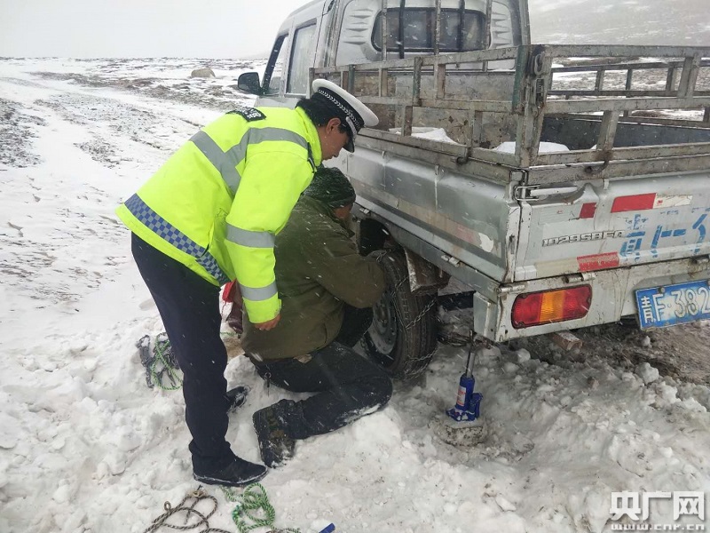 交警幫助被困司機安裝防滑鏈 央廣網(wǎng)發(fā) 瑪多交警供圖