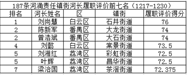 同時(shí),本期公布了187條河涌鎮(zhèn)(街)河長履職評(píng)價(jià)前七名和村(居)級(jí)河長履職評(píng)價(jià)前十名名單。另外,本期河長履職情況整體不錯(cuò)較上月都有明顯進(jìn)步,為此本期暫不曝光最后幾名。鎮(zhèn)(街)級(jí)河長履職前七名分別是:白云區(qū)石井街道劉尚慧、番禺區(qū)大龍街道陳新軍、番禺區(qū)大石街道曾浩斌、白云區(qū)棠景街道劉懿、荔灣區(qū)彩虹街道劉湘紅、荔灣區(qū)昌華街道葉輝、荔灣區(qū)茶滘街道梁治國。村(居)級(jí)河長履職前十名分別是(個(gè)別分?jǐn)?shù)一樣):番禺區(qū)小谷圍街道屈哨兵、荔灣區(qū)嶺南街道和平社區(qū)居民委員會(huì)蕭潔雯、花都區(qū)新雅街道雅瑤舊村村委會(huì)鄧榮添、番禺區(qū)南村鎮(zhèn)塘西村民委員會(huì)邵豪英、花都區(qū)新雅街道廣塘村委會(huì)劉杞良、花都區(qū)新雅街道石塘村委會(huì)黃河燎、荔灣區(qū)昌華街道西關(guān)大屋社區(qū)居民委員會(huì)何敏婷、越秀區(qū)東山街道樂景社區(qū)居民委員會(huì)劉春苗、荔灣區(qū)嶺南街道清平社區(qū)居民委員會(huì)劉雯雯、荔灣區(qū)西村街道增埗社區(qū)居民委員會(huì)胡勇山、番禺區(qū)大龍街道茶東村民委員會(huì)曹英權(quán)、荔灣區(qū)南源街道環(huán)翠園社區(qū)居民委員會(huì)梁曉華、番禺區(qū)鐘村街道鐘村四村民委員會(huì)盧杰洪、花都區(qū)新華街道新街村委會(huì)曾超波。