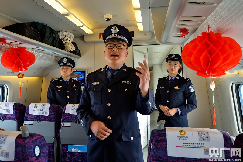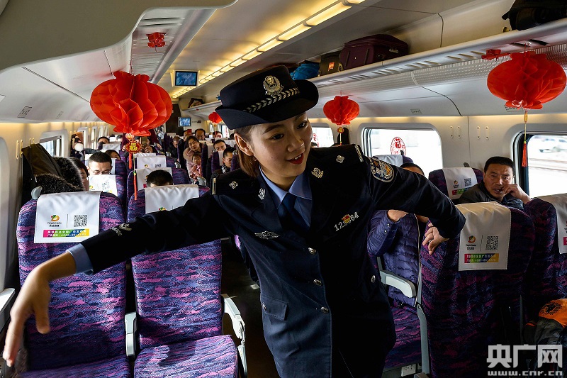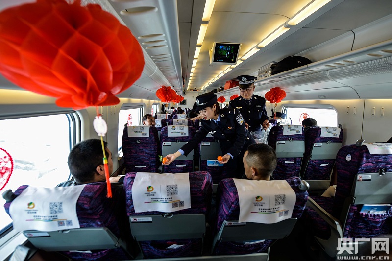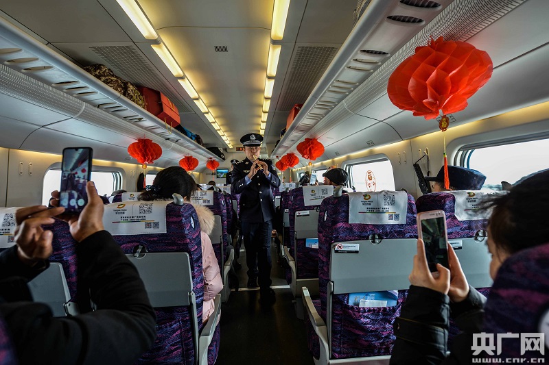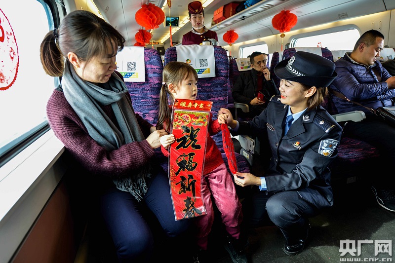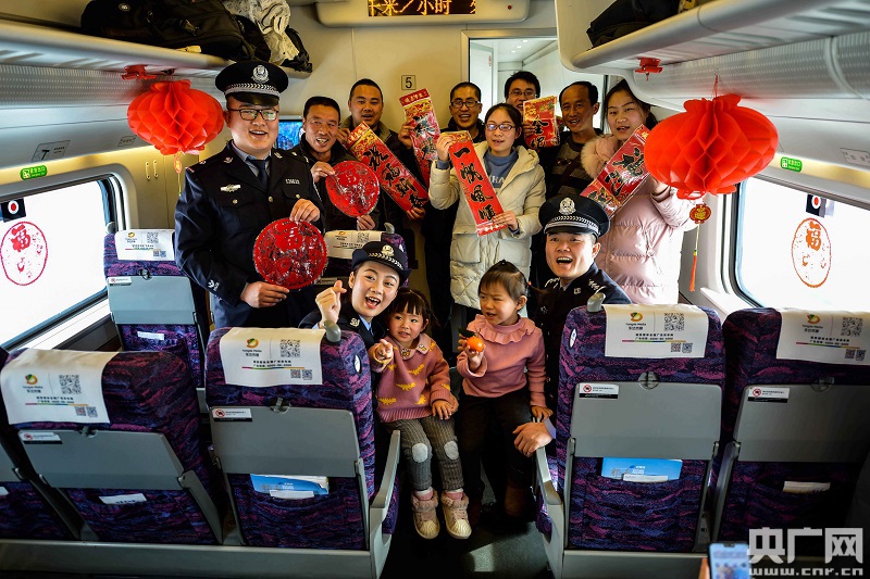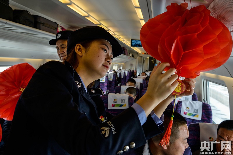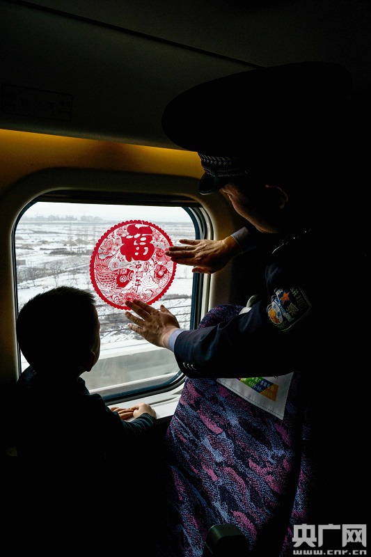 文藝小分隊(duì)民警在高鐵車(chē)廂貼福字窗花(央廣網(wǎng)發(fā) 劉東帥攝)