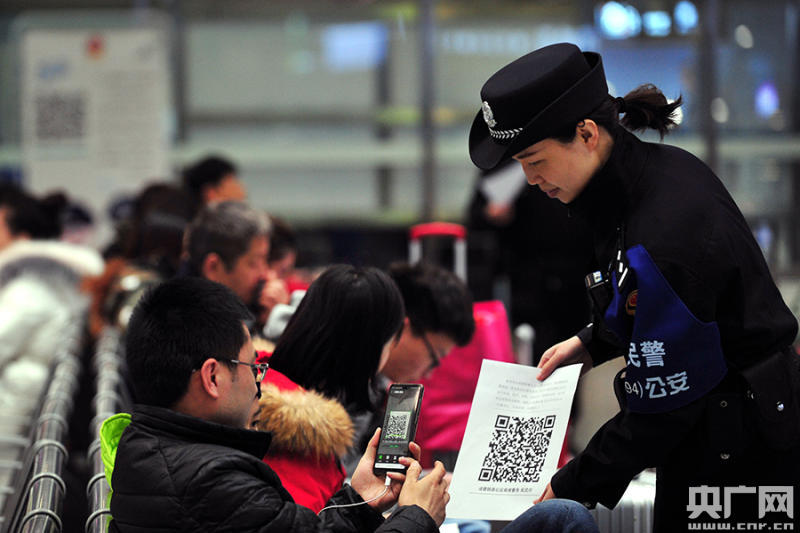 2月10日,民警在雙流機(jī)場高鐵站向旅客宣傳推廣微警務(wù)服務(wù)平臺(央廣網(wǎng)發(fā) 通訊員供圖)