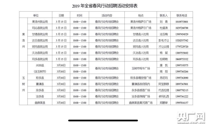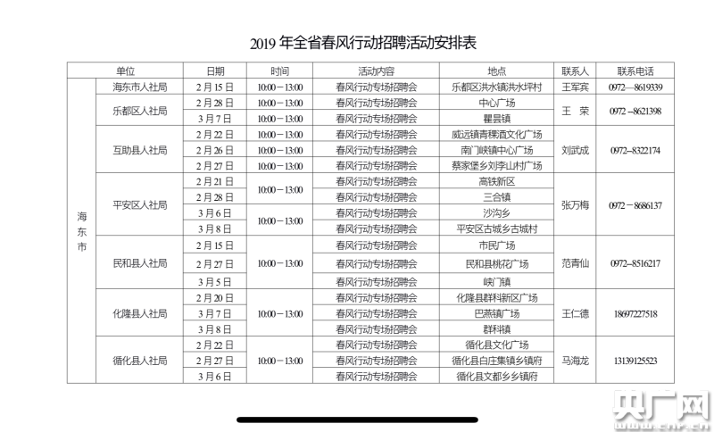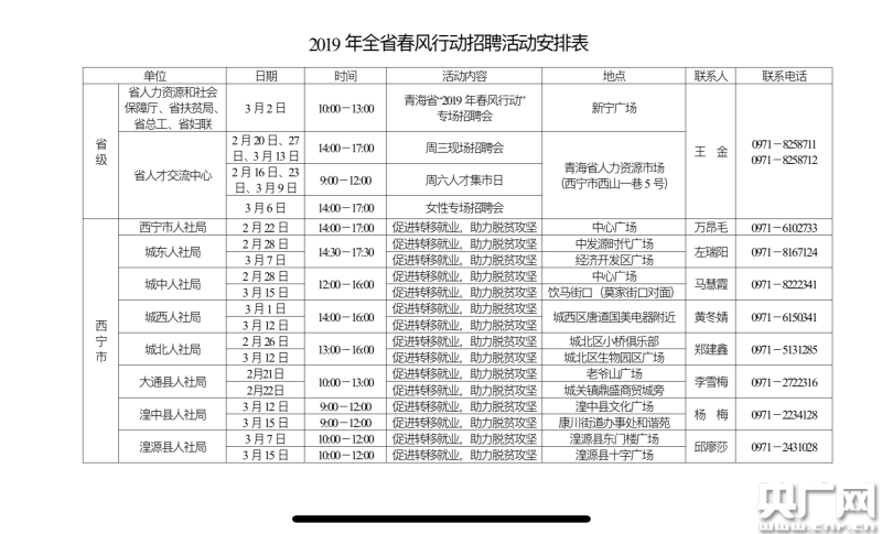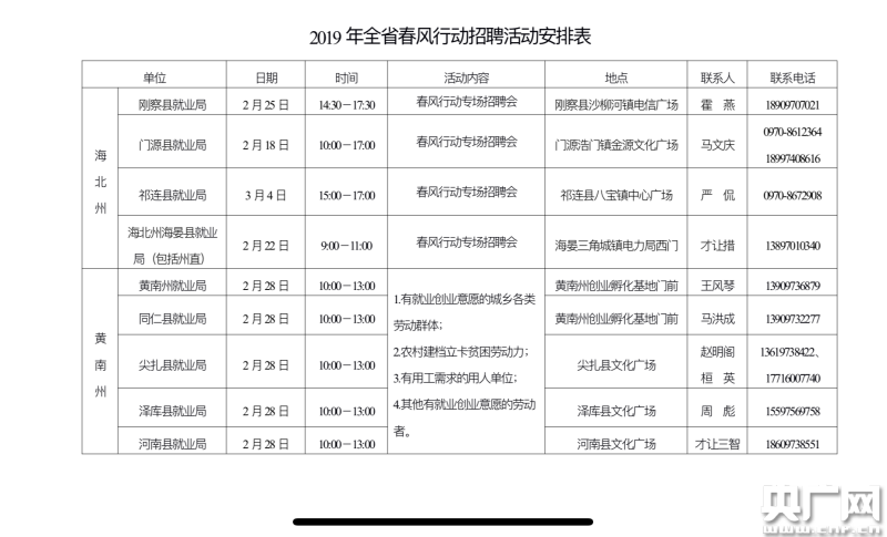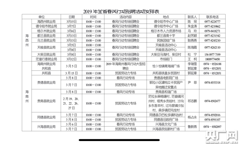 青海省內(nèi)兩市六州將于3月中旬前在當(dāng)?shù)嘏e辦“春風(fēng)行動行動專場”、“貧困勞動力專場”等多場招聘會,廣大求職者及用人單位可踴躍參加。