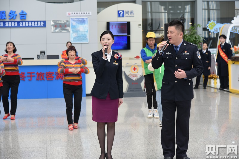 上午9時許,由機(jī)關(guān)黨支部黨員志愿者、團(tuán)員青年以及鐵路社區(qū)居民志愿者組成的小分隊,聯(lián)袂為旅客表演歌舞快閃《我和我的祖國》、大合唱《路上有我》等文藝節(jié)目。