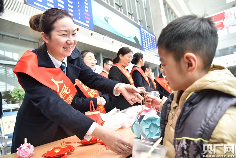黨團(tuán)員們還為旅客發(fā)放花燈,并送上一碗碗熱氣騰騰的湯圓!疤钗殷@喜了,元宵節(jié)能在高鐵站看到歌舞表演,還能吃上熱乎乎的湯圓,暖到心窩里了。”正準(zhǔn)備乘坐G1680次去杭州的王女士接過黨員志愿者端來的香甜可口的湯圓,感慨萬分。