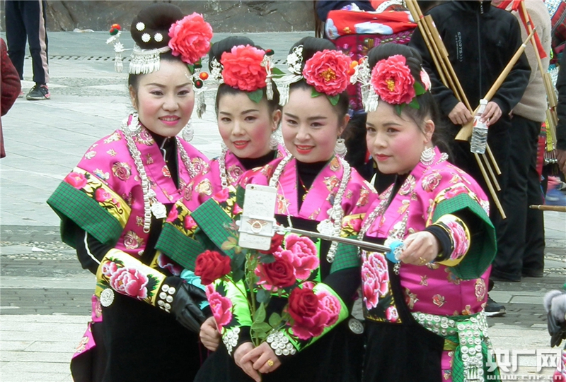 2月21日,參加活動的苗族姑娘們在自拍留紀(jì)念。(央廣網(wǎng)發(fā) 姜澤鵬 攝)