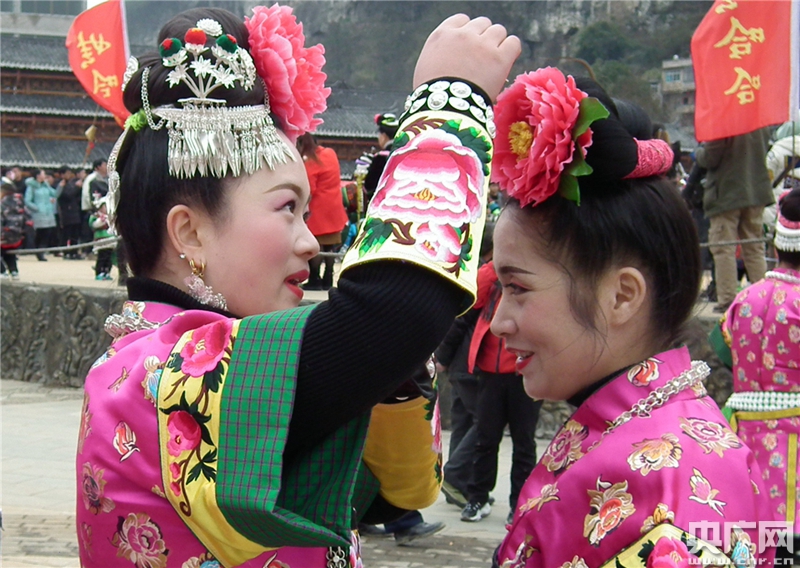 2月21日,一位苗族媽媽在為參加活動的女兒整理頭花。(央廣網(wǎng)發(fā) 姜澤鵬 攝)