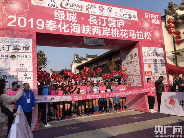 央廣網(wǎng)寧波3月25日消息(記者曹美麗 通訊員嚴世君)2019奉化海峽兩岸桃花馬拉松24日上午在浙江省寧波市奉化區(qū)溪口浪漫開跑。來自美國、英國、西班牙、新加坡、印度、韓國、德國等20個國家以及30多個省、直轄市、自治區(qū)的選手參賽,8400余名運動員共同奔跑在桃花盛開、繽紛爛漫的賽道上。