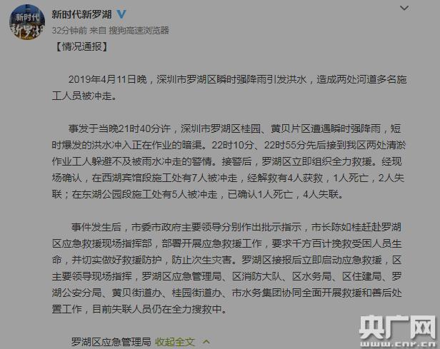 事發(fā)于當晚21時40分許,深圳市羅湖區(qū)桂園、黃貝片區(qū)遭遇瞬時強降雨,短時爆發(fā)的洪水沖入正在作業(yè)的暗渠。22時10分、22時55分先后接到我區(qū)兩處清淤作業(yè)工人躲避不及被雨水沖走的警情。接警后,羅湖區(qū)立即組織全力救援。經(jīng)現(xiàn)場確認,在西湖賓館段施工處有7人被沖走,經(jīng)解救有4人獲救,1人死亡,2人失聯(lián);在東湖公園段施工處有5人被沖走,已確認1人死亡,4人失聯(lián)。