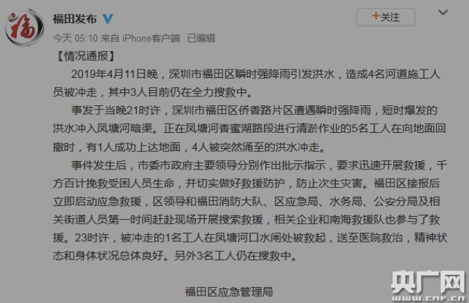 事件發(fā)生后,深圳市委市政府主要領(lǐng)導分別作出批示指示,要求迅速開展救援,千方百計挽救受困人員生命,并切實做好救援防護,防止次生災害。福田區(qū)接報后立即啟動應急救援,區(qū)領(lǐng)導和福田消防大隊、區(qū)應急局、水務局、公安分局及相關(guān)街道人員第一時間趕赴現(xiàn)場開展搜索救援,相關(guān)企業(yè)和南海救援隊也參與了救援。23時許,被沖走的1名工人在鳳塘河口水閘處被救起,送至醫(yī)院救治,精神狀態(tài)和身體狀況總體良好。另外3名工人仍在搜救中。