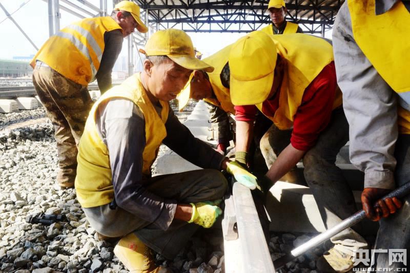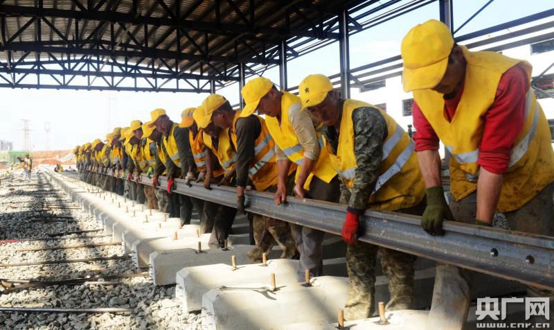 中鐵十一局集團(tuán)三公司施工人員正在鋪軌作業(yè)(央廣網(wǎng)發(fā) 張偉明 攝)