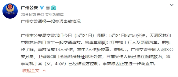 央廣網(wǎng)廣州5月21日消息(記者鄭澍)廣州市公安局交警部門今日通報(bào):5月21日8時(shí)50分許,天河區(qū)林和中路林樂路口發(fā)生一起交通事故。肇事車輛闖紅燈并撞上行人及兩輛汽車。據(jù)初步了解,事故造成13人受傷,其中2人傷勢較重。