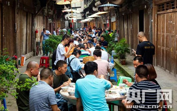 6月6日,大同古鎮(zhèn)上的游客與當(dāng)?shù)厝罕娨黄鸸捕榷宋绻?jié)。(央廣網(wǎng)發(fā) 赤水市融媒體中心提供圖片)