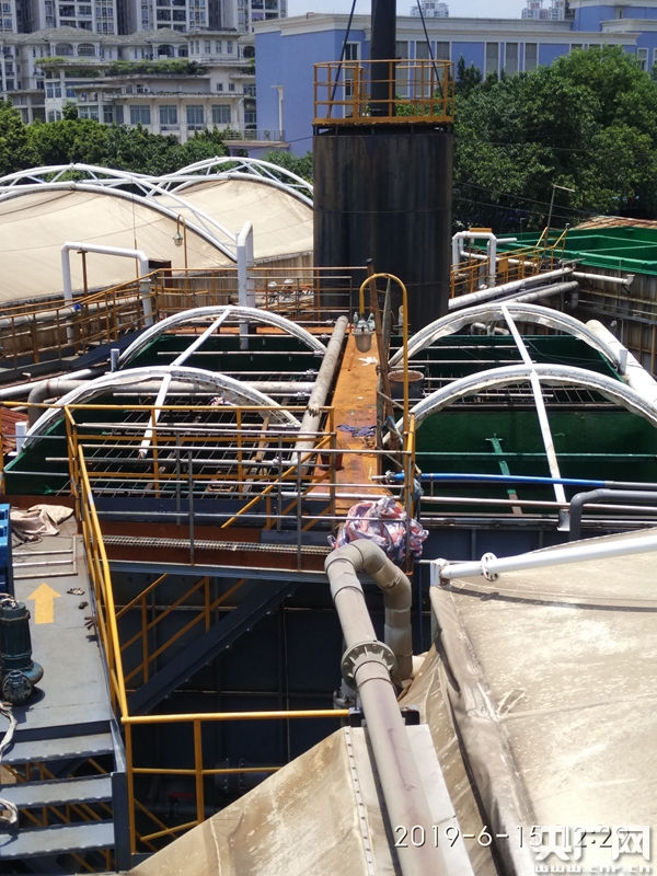 檢查人員來到該廠自建的污水處理廠,在圍墻外已可見有污水從圍墻內(nèi)向公共道路路面滲漏。還沒進(jìn)入污水處理廠房,遠(yuǎn)遠(yuǎn)可聞如瀑布飛流的聲音。原來,該污水處理廠除儲(chǔ)水設(shè)施正在整修未運(yùn)行外,還有一個(gè)處理污水的巨型槽罐發(fā)生爆漏,未經(jīng)完全處理的污水從約6米高處飛流直泄,罐身、地面四周污水橫流,污水處理廠內(nèi)一片澤國(guó)。