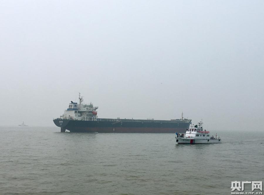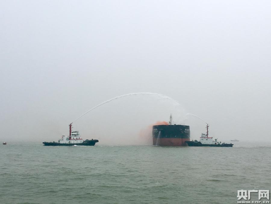 演習(xí)現(xiàn)場(chǎng),兩艘救援船在協(xié)助“神華505”滅火。(央廣網(wǎng)見(jiàn)習(xí)記者 張曉琳 攝)