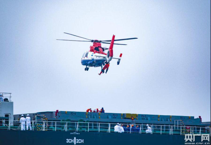 演習(xí)現(xiàn)場(chǎng),直升機(jī)在轉(zhuǎn)移船上傷員。(央廣網(wǎng)發(fā) 滄州海事局供圖)