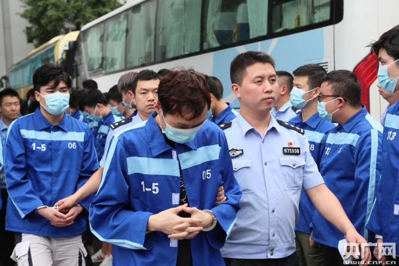 6月15日下午,127名犯罪嫌疑人在民警的押解下,經(jīng)過24小時的長途跋涉,被押解回蓉。
