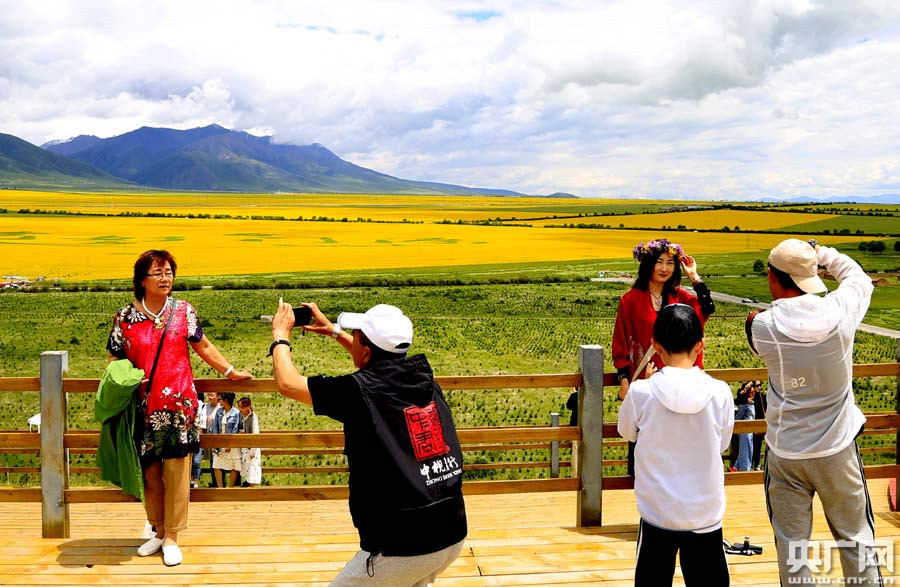 游客在門源百里油菜花海景區(qū)拍照(央廣網(wǎng)記者 張雷 攝)