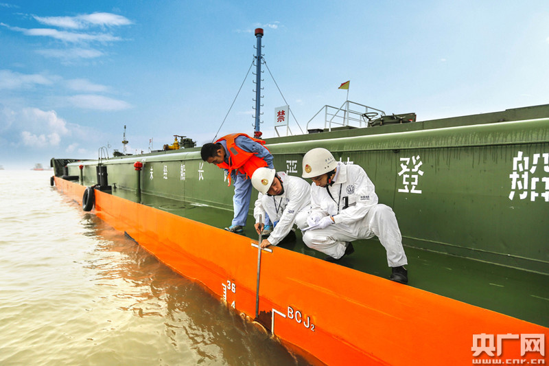 檢查船舶吃水情況。(央廣網(wǎng)發(fā) 長江海事局供圖)